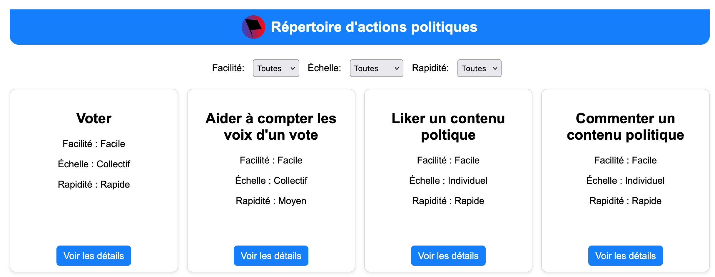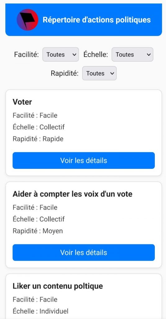 Pour les collectifs militants, on a créé un template personnalisable pour qu’ils puissent lister des actions inspirantes pour aider les gens à passer à l’action pour tous types de situations politiques. Pour les activistes, suivre ce lien du répertoire d’actions politiques.